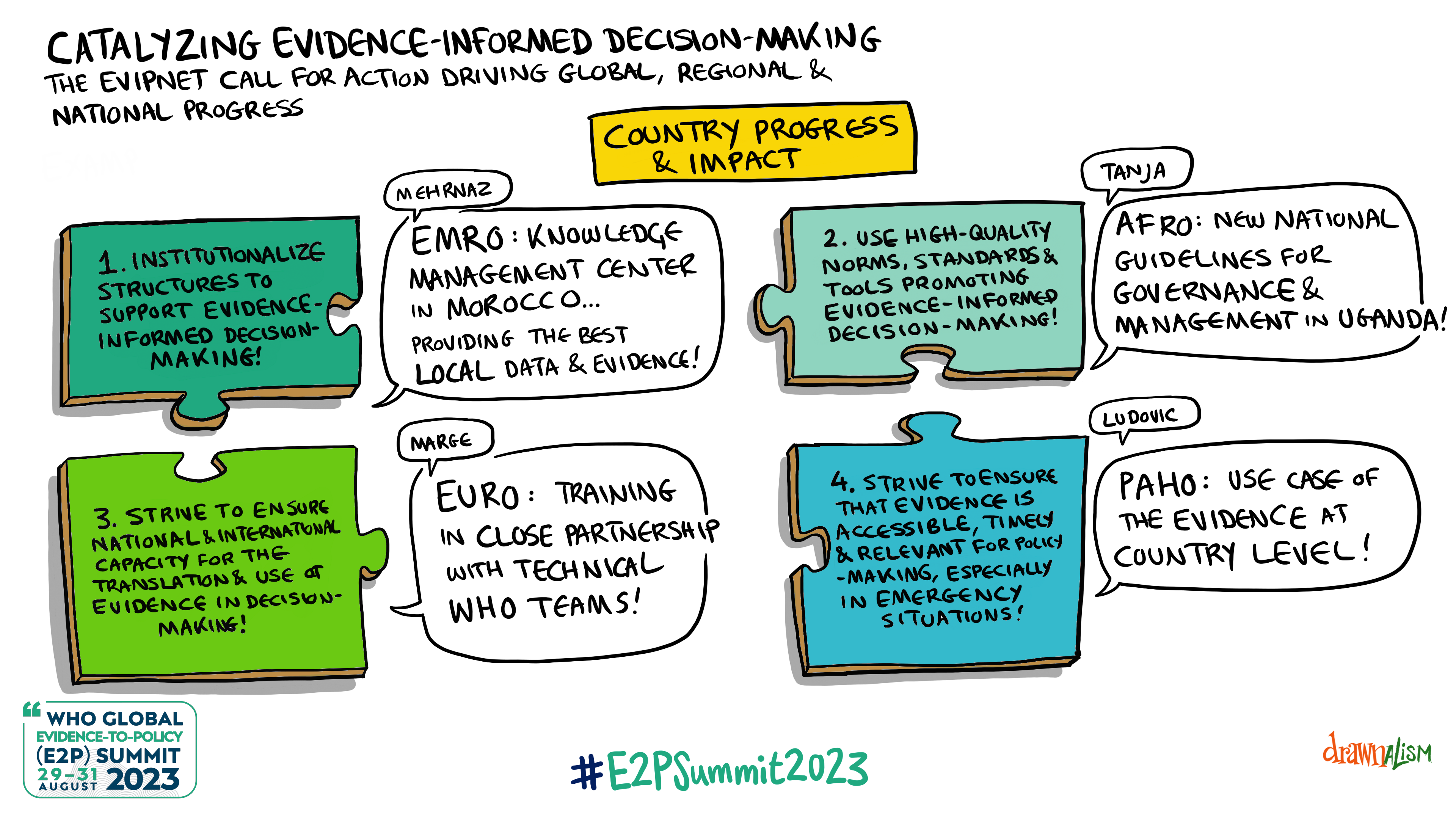 The WHO Global E2P Summit 2023 brought together researchers and policy-makers from various WHO regions with international institutions, Member States, universities, research institutes and partners. The aim was to take stock of progress on the Call for Action from the WHO E2P Summit 2021, identify common challenges, share innovations and lessons learned, and provide recommendations for supporting evidence-informed decision-making to spur progress towards the Sustainable Development Goals and Triple Billion targets.