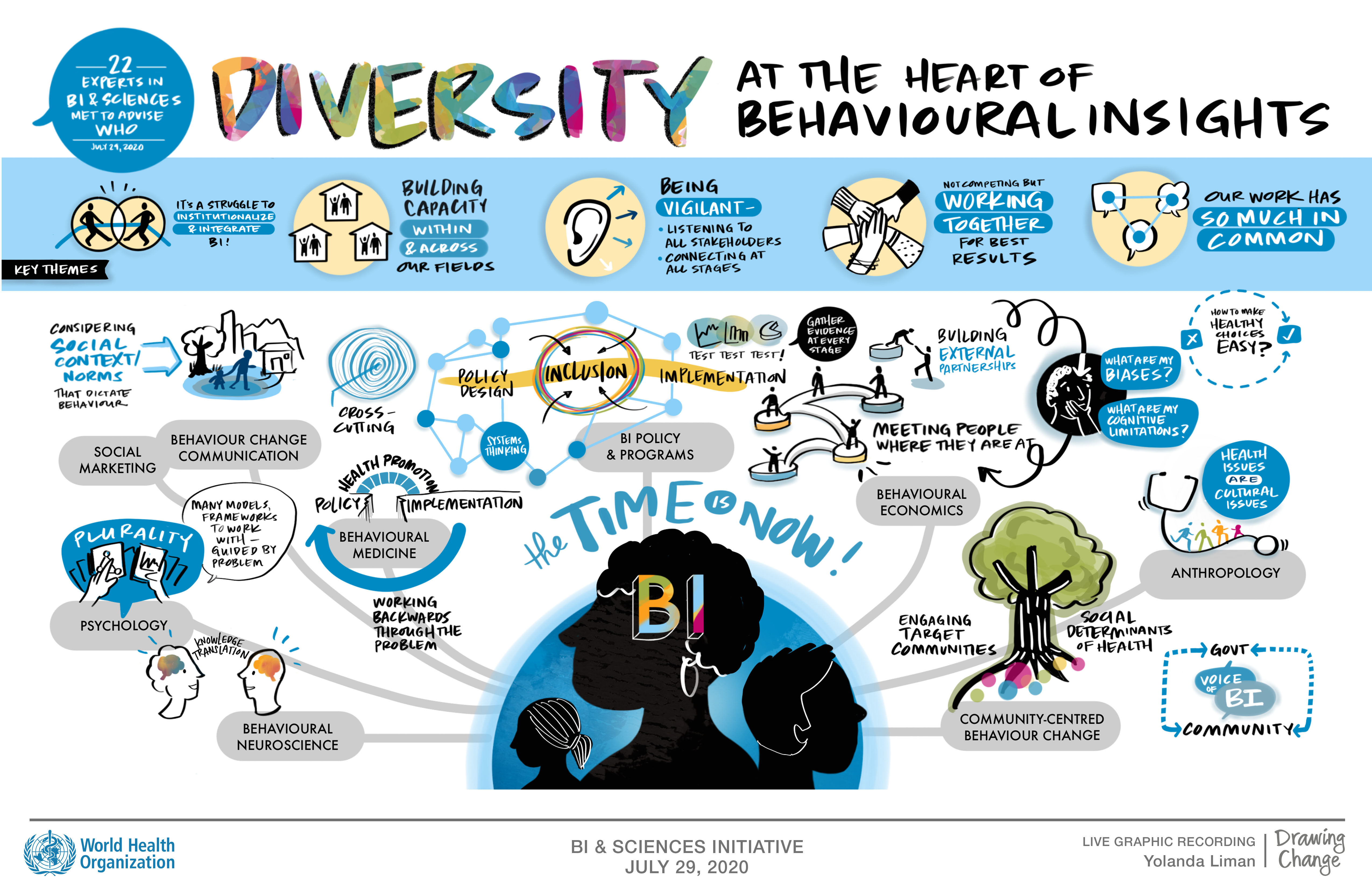 The image above captures the diversity of disciplines and areas of work that contributes to understanding human behaviour to improve health policies and programmes. The contributions were discussed by the members of the Technical Advisory Group during the introductory meeting on July 20, 2020. Click here to download image in full size