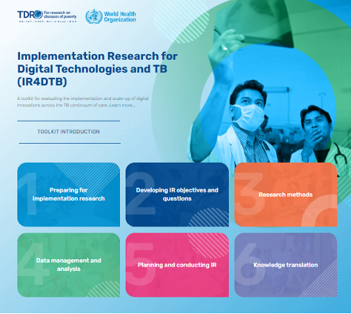 The Implementation Research for Digital Technologies and TB (IR4DTB) toolkit aims to build capacity in IR and help fill knowledge gaps around using and scaling up digital technologies for TB care. The interactive toolkit comprises six modules that reflect key steps in the IR process: