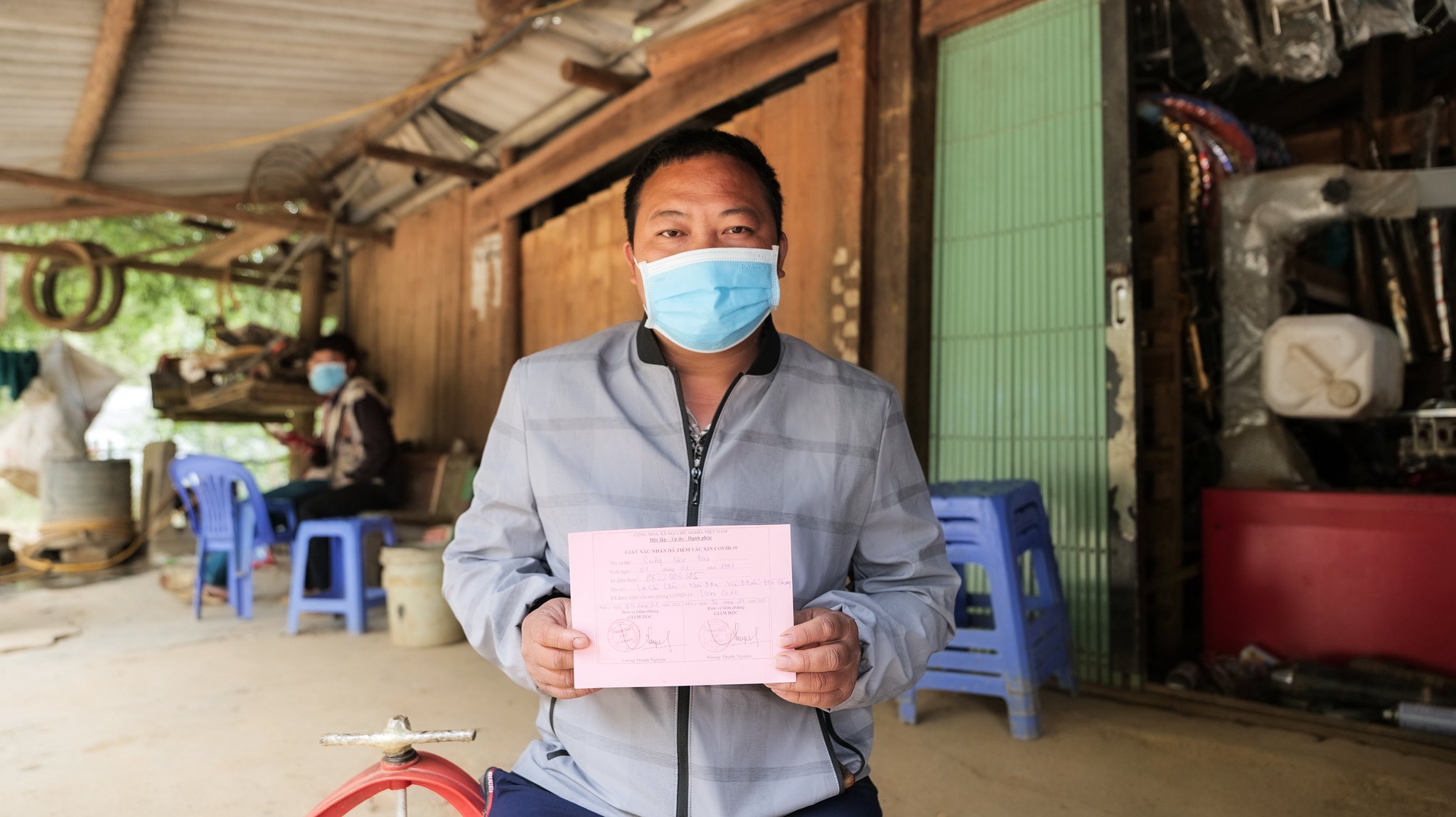 So, Mr Pao drives around on his motorbike, a giant loudspeaker strapped to the back broadcasting recorded messages about vaccination and COVID-19 measures in Vietnamese and the local Dao language. He also drives house to house, and talks to people about COVID-19.
