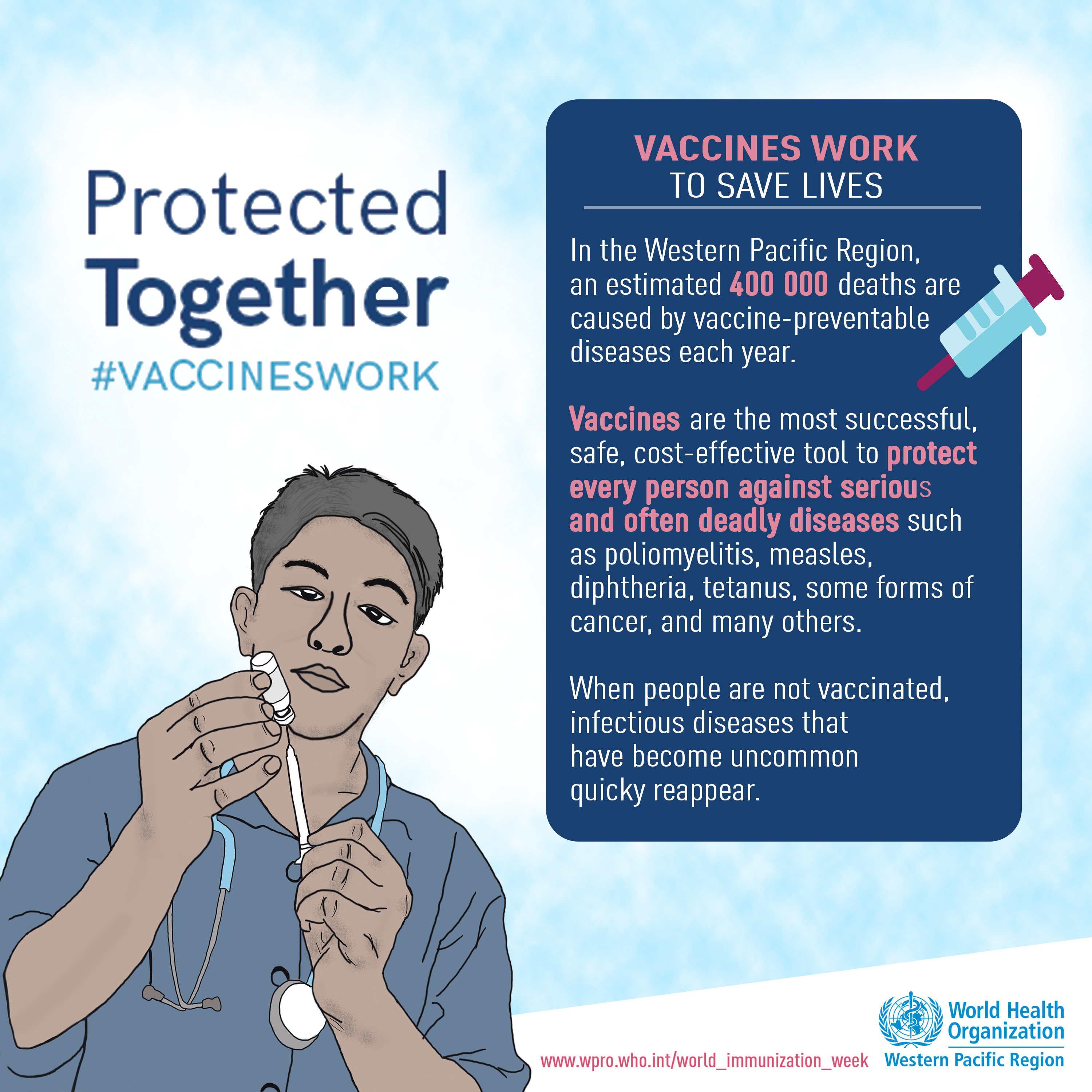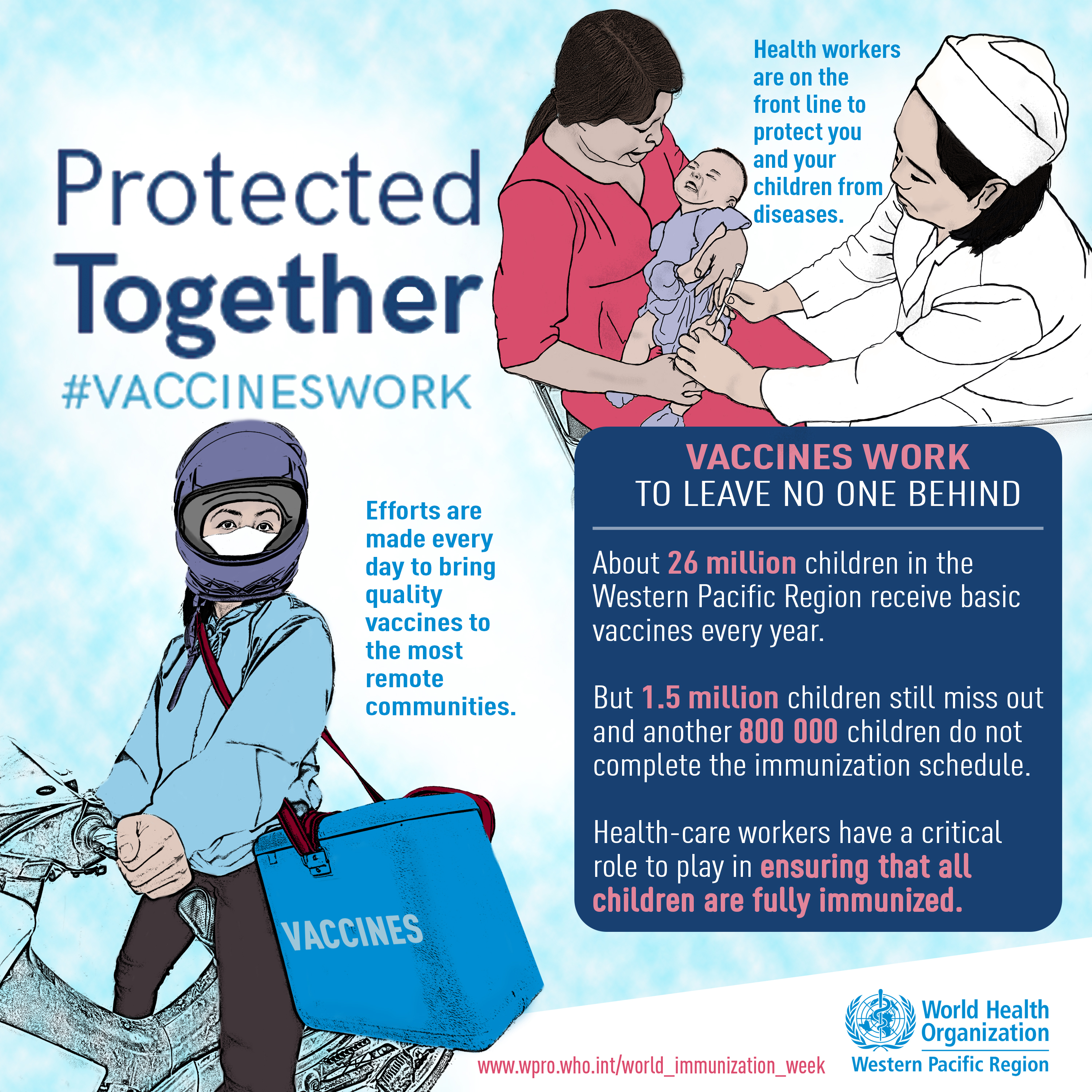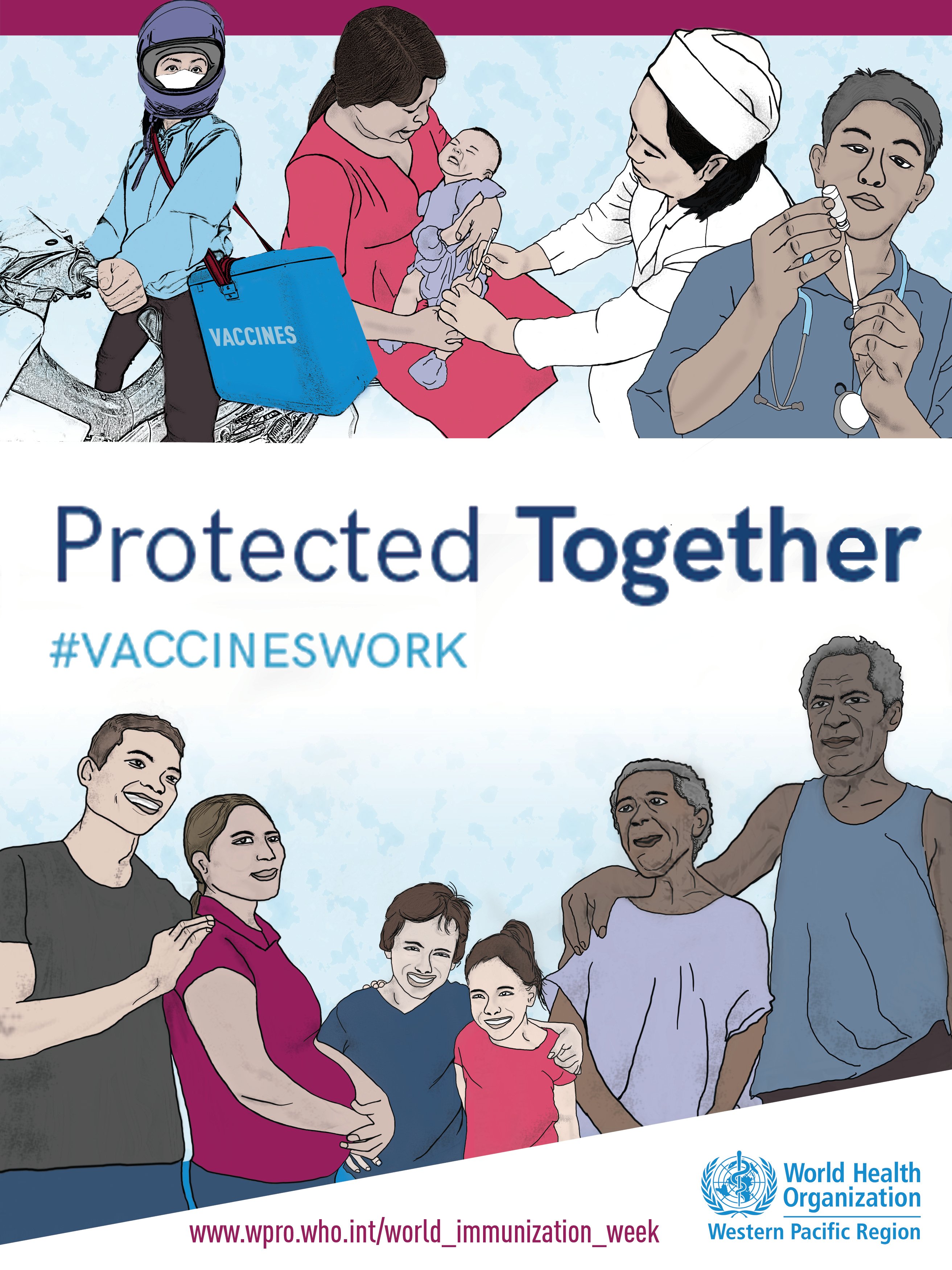The goal of World Immunization Week 2018 is to urge greater action on immunization, with particular focus on highlighting the role that everyone can play in this effort: parents, health-care workers, policy-makers, media, and ultimately everyone, to work together to ensure that every child in every country gets the vaccines they need. This year’s theme: “Protected Together, #VaccinesWork”, encourages people at every level, from policy makers to parents, to go further in their efforts to increase immunization coverage for the greater good.